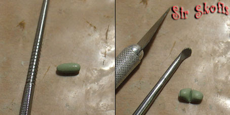 After the step 3, the putty will have a rounded form and we are interested in a more regular one. We start by cutting the outer shape of the thing we are trying to do from the rounded form, in this case a wing shape. It is useful to wet the edge of the hobby knife before doing the cuts.